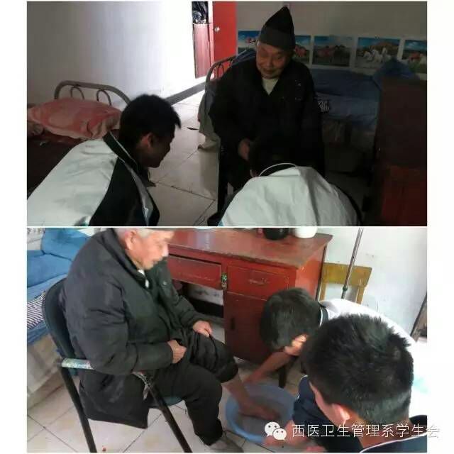 走进敬老院,院子里坐满了老人,老人们个个面带微笑,同学们热情地向他们问好并积极地询问能否为他们做一些事情。看到有位老人腿脚不便,同学们就直接挽起袖子为老爷爷洗了脚和头。老人说他曾经是一位革命战士,今年已经90岁了,却依旧健朗,他骄傲的告诉我们他参加过四大战役,经历过多次生与死的考验,我们对老爷爷的敬佩之情油然而生。