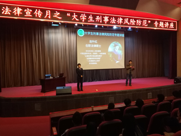 (卫生管理系)为贯彻省教育厅“《陕西省教育系统开展法治宣传教育的第七个五年规划(2016-2020年)》的通知”精神,由我校党委宣传部、校团委主办,卫生管理系承办的法治宣传月之“大学生刑事法律风险防范”专题讲座于12月12日下午2:00,在学术报告厅顺利进行。此次讲座面向全校师生,近500人参与。