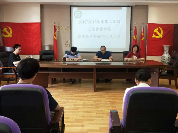 2019年6月6日,卫生管理学院在会议室组织召开了2018-2019学年第二学期期中教学检查师生座谈会,卫生管理学院副院长苗建宁、党总支副书记刘建刚、教学科长任㛃、各教研室主任、各年级学习班长及学生代表参加了会议。会议旨在了解卫生管理学院学生在学习、生活中出现的各种问题,并尽力一一解决,从而为同学们创造更好的学习环境。
