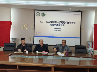 2021年11月22日14:00,卫生管理学院在学院会议室召开了2021-2022学年第一学期期中教学检查师生代表座谈会。校督导王惠民教授、院党总支书记刘建刚、院长苗建宁、教研室主任和教师代表、公管专业和劳保专业各班的教学信息员和学生代表参加会议。