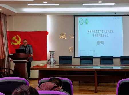 2021年11月19日14:00,卫生管理学院在学院会议室召开医学科研诚信与作风学风建设专项教育整治会议。学院全体教职人员(含管理兼教学教师、双肩挑教师)参加会议,会议由卫生管理学院院长苗建宁主持。