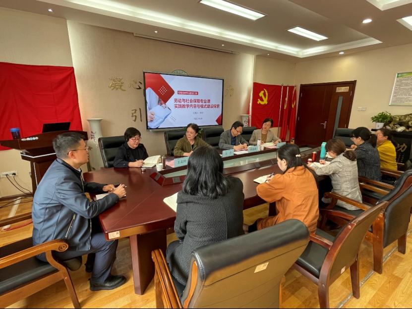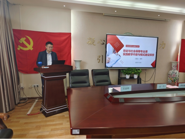 劳动与社会保障专业负责人余舟围绕劳动与社会保障专业课实践教学内容与模式建设探索进行汇报。汇报中,聚焦提升学生“就业实践能力”与“研究创新能力”,围绕教学资源与行业的打通,课程组合联动设计、教师教学能力的提升、学生自主学习能力的训练、教学管理细节的强化、学生创新实践参与六个维度进行了汇报。