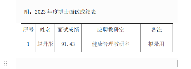 根据《西安医学院2023年度人才公开招聘工作实施方案》(西医党发〔2023〕17号)有关要求,按照学校工作安排,西安交通大学博士赵丹彤已于2023年12月15日参加卫生管理学院学院面试,现将面试成绩予以公示,公示期5个工作日。