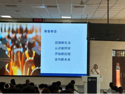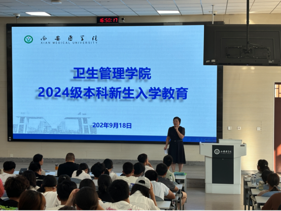 9月18日, 卫生管理学院在教学楼阶梯教室召开2024级新生入学教育大会。学院党总支书记苗建宁、院长韩文霞、副院长王志玲、党总支副书记魏慧、教学科科长任杰、学生科科长贺宇姣、团总支书记孟骊超、新生辅导员杨靖以及全体2024级新生参会, 会议由魏慧主持。